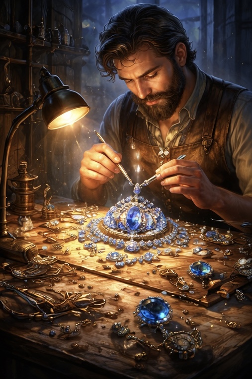 Con el tiempo, Elías transformó aquellos conocimientos en creaciones únicas. Sus vitrinas comenzaron a llenarse de gargantillas de perlas luminosas, pulseras de rubíes ardientes y broches de amatistas misteriosas. La fama de su talento recorrió toda la ciudad, y pronto fue reconocido como el mejor joyero de todos, no solo por la belleza de sus piezas preciosas, sino por el brillo especial que parecía latir en cada una de ellas, como si la llave de oro hubiera abierto también la puerta de su propio genio