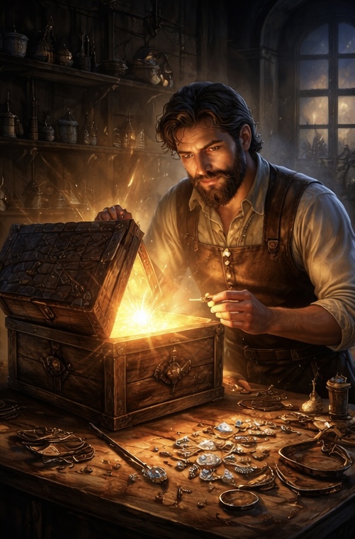 Al llegar a su taller, la llave comenzó a irradiar un resplandor cálido frente a un viejo cofre olvidado en un rincón. Al probarla, el cofre se abrió con un suave chasquido, revelando diseños antiguos de joyas extraordinarias: collares de zafiros profundos como el océano, coronas engastadas con esmeraldas vivas como la primavera y anillos de diamantes que atrapaban la luz como pequeñas estrellas. Pero más que tesoros materiales, el cofre parecía susurrarle secretos sobre el arte, la paciencia y la perfección en cada