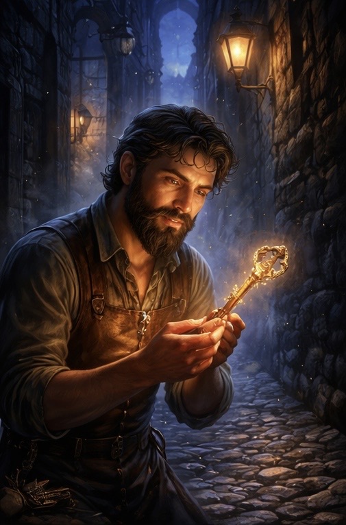En una ciudad antigua de calles empedradas y faroles titilantes, vivía un humilde joyero llamado Elías. Una noche, al cerrar su pequeño taller, decidió tomar un atajo por un callejón oscuro y tenue. Allí, entre sombras y ecos lejanos, algo brilló en el suelo húmedo: era una llave de oro finamente tallada, con grabados tan delicados como los de un anillo de compromiso. Intrigado, la guardó en su bolsillo sin