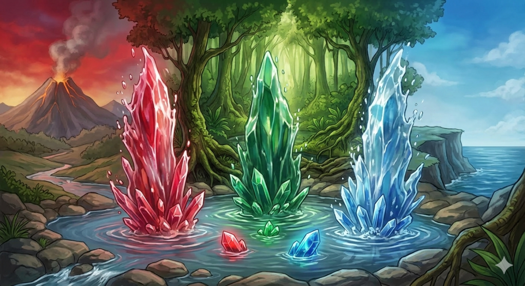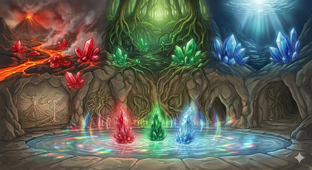 Por eso, cuando estas tres joyas descansan juntas, se escucha un murmullo que no es de este mundo. El rubí es el agua que canta con la fuerza del géiser; la esmeralda es el agua que nutre y calla en el bosque; y el zafiro es el agua que sueña en el fondo del océano. Son las tres voces del agua, el espejo trino en el que el mundo contempla su propia alma líquida, hecha piedra pero siempre viva.